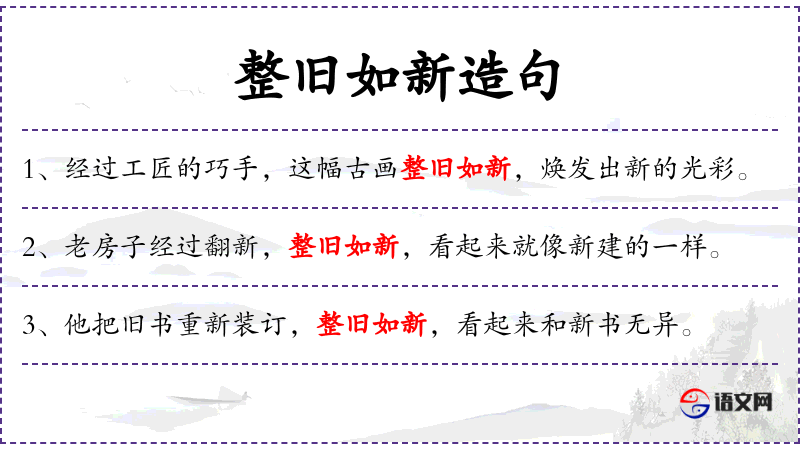 - 整旧如新:通过修复和改造,使旧物看起来像新的一样。