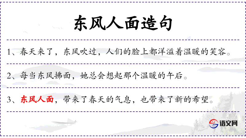 - “东风带来了春天的气息,人们的脸上洋溢着温暖的笑容。”