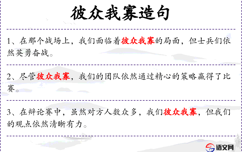 成语:“彼众我寡”源自古代兵法,强调在人数劣势下如何取胜。 典故**:“脱颖而出”源自《史记·平原君虞卿列传》,比喻才能完全显露出来。