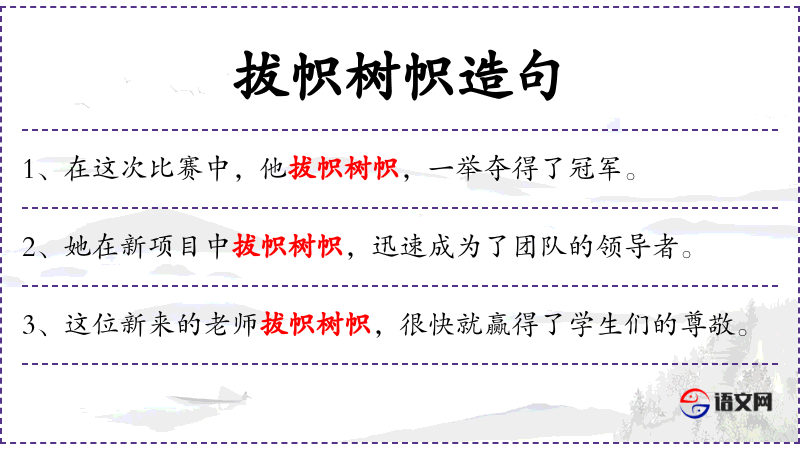 - 拔帜树帜:这是一个成语,意为在比赛中取得胜利,树立新的标杆。