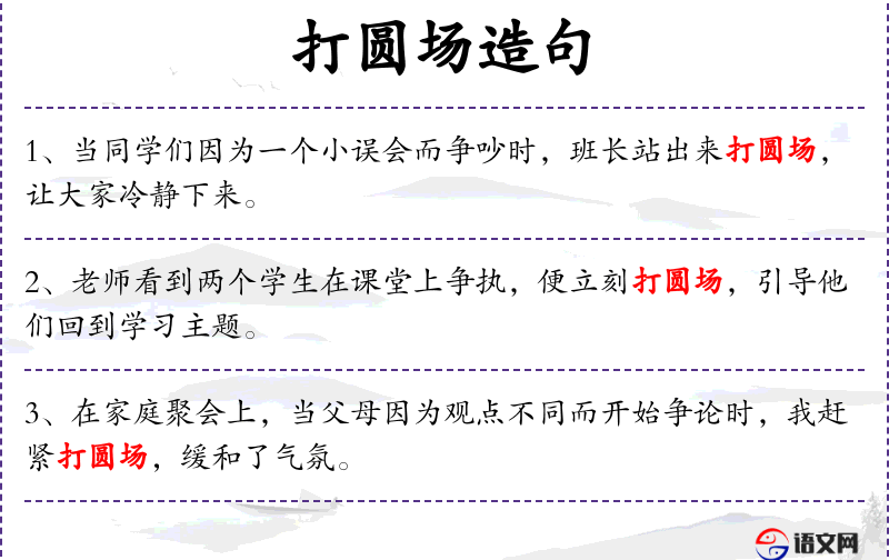 - 班长在同学们因为一个小误会而争吵时,站出来打圆场,希望平息争执。