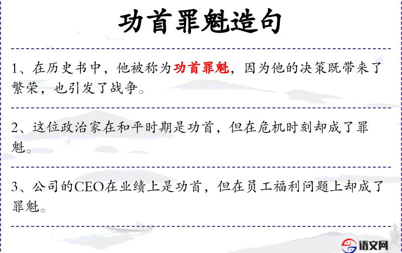 句子中使用的“功首”和“罪魁”是文化中常用的表达方式,用来评价一个人在不同情境下的表现。这些词汇蕴含了人对功过是非的传统观念。