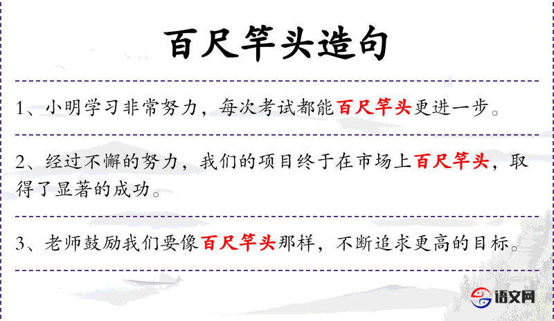 7. 【百尺竿头】 桅杆或杂技长竿的顶端。比喻极高的官位和功名,或学问、事业有很高的成就。