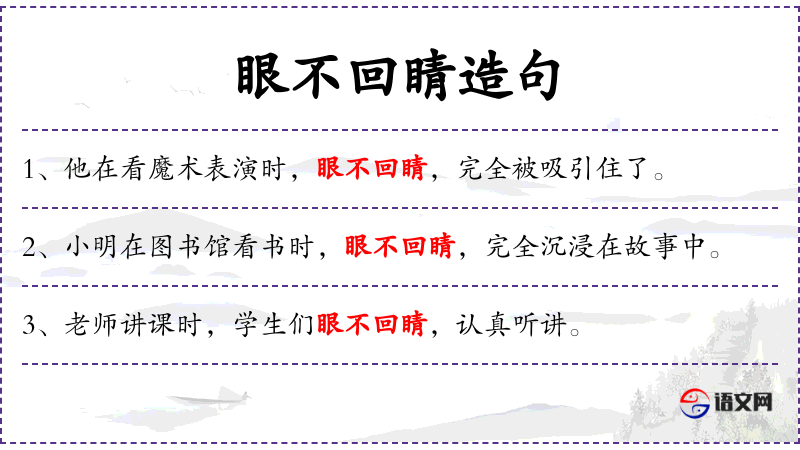 4. 【眼不回睛】 - 眼珠一转不转。形容注意力集中,看得出神