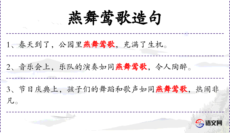 5. 【燕舞莺歌】 - 燕子在飞舞,黄莺在鸣叫。形容春光明媚。同“燕舞莺啼”。