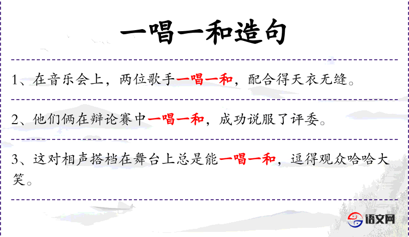 1. 【一唱一和】 - 一个先唱,一个随声应和。原形容两人感情相通。现也比喻二人互相配合,互相呼应。