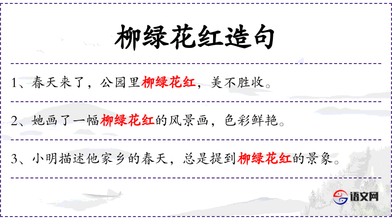 5. 【柳绿花红】 - 形容明媚的春天景象。也形容颜色鲜艳纷繁。
