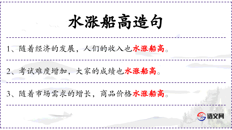 5. 【水涨船高】 水位升高,船身也随之浮起。比喻事物随着它所凭借的基础的提高而增长提高。