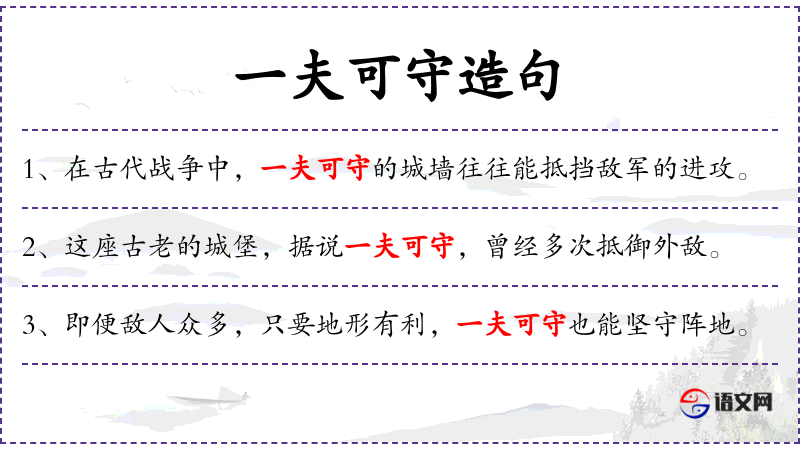 1. 【一夫可守】 一夫:一个人;守:把守。一个人就能把守住。形容地势险要,易于防守。