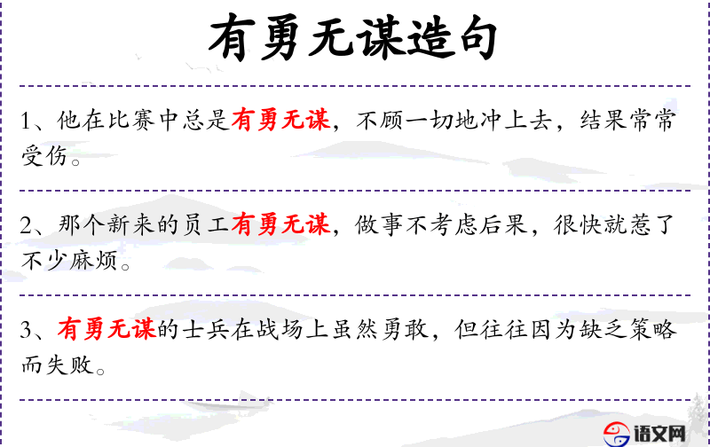 2. 【有勇无谋】 - 只有勇气,没有计谋。指做事或打仗只是猛打猛冲,缺乏计划,不讲策略。