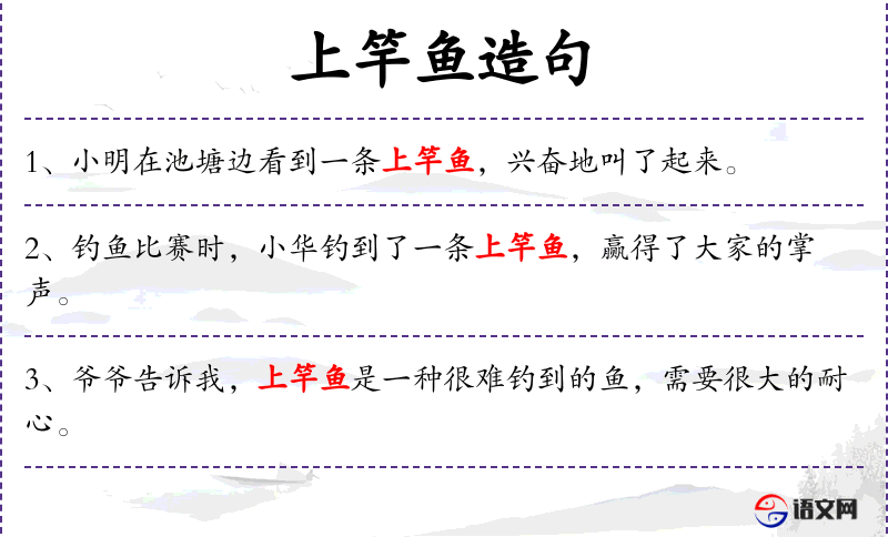 1. 【上竿鱼】 - 宋欧阳修《归田录》卷二"梅圣俞以诗知名三十年,终不得一馆职。晩年与修《唐书》……其初受敕修《唐书》,语其妻刁氏曰'吾之修书,可谓猢狲入布袋矣!'刁氏对曰'君于仕宦,亦何异鲇鱼上竹竿耶?'"后以"上竿鱼"比喻羁身仕途﹑难以自脱的人。