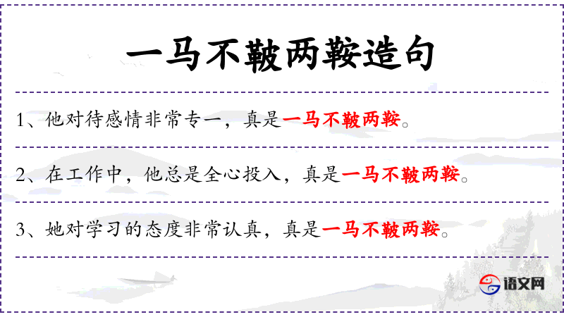 2. 【一马不鞁两鞍】 - 鞁:通“鞴”,把鞍辔等套在马上。一匹马不套两个辔,只套一个。比喻一女不嫁二夫,即从一而终。