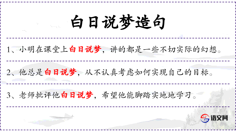 4. 【白日说梦】 大白天说梦话。比喻毫无根据地说话。