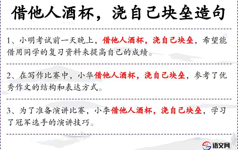 - 借他人酒杯,浇自己块垒:成语,比喻借用他人的东西来解决自己的问题。