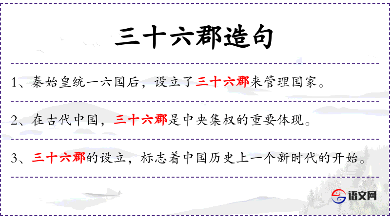 1. 【三十六郡】 秦始皇二十六年(公元前二二六年)分全国为三十六郡。《史记.秦始皇本纪》"﹝二十六年﹞分天下以为三十六郡。"裴髎集解"三十六郡者,三川﹑河东﹑南阳﹑南郡﹑九江﹑鄣郡﹑会稽﹑颍川﹑砀郡﹑泗水﹑薛郡﹑东郡﹑琅邪﹑齐郡﹑上谷﹑渔阳﹑右北平﹑辽西﹑辽东﹑代郡﹑巨鹿﹑邯郸﹑上党﹑太原﹑云中﹑九原﹑雁门﹑上郡﹑陇西﹑北地﹑汉中﹑巴郡﹑蜀郡﹑黔中﹑长沙凡三十五,与内史为三十六郡。"清姚鼐《复谈孝廉书》"按《秦始皇纪》,分天下为三十六郡在其二十六年,迄三十三年,略取陆梁地为桂林﹑象郡﹑南海,是已为三十九郡。至秦亡时,或更有分合,不知凡若干郡也。"