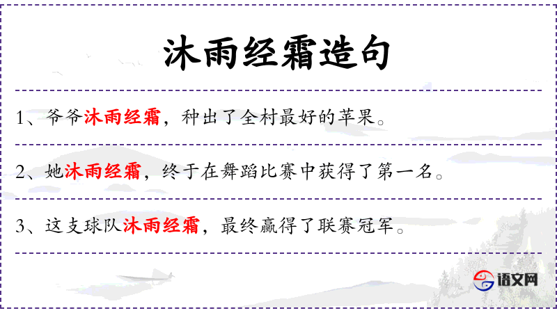 2. 【沐雨经霜】 - 指承受雨淋霜打。形容历尽辛苦。