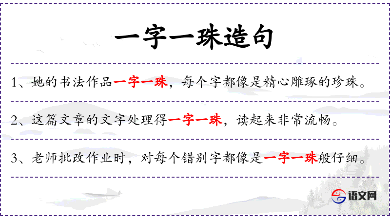 1. 【一字一珠】 - 一个字就象一颗珍珠。形容歌声婉转圆润。也比喻文章优美,辞藻华丽。