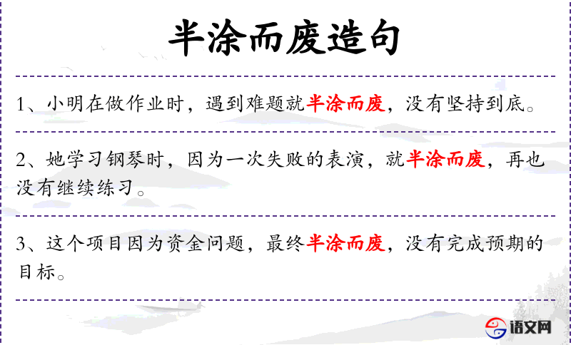 - 半涂而废:成语,表示事情做了一半就放弃了。