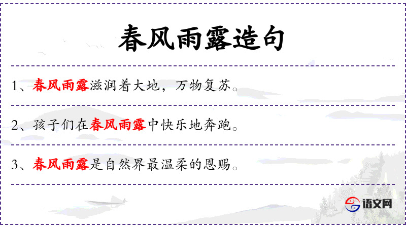 - 春风雨露:指春天的风雨和露水,状语,形容孩子们活动的环境。