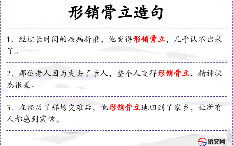 “形销骨立”是一个汉语成语,源自古代文学,形容人非常瘦弱。这个成语的使用体现了汉语中对形象描述的丰富性和文化传承。