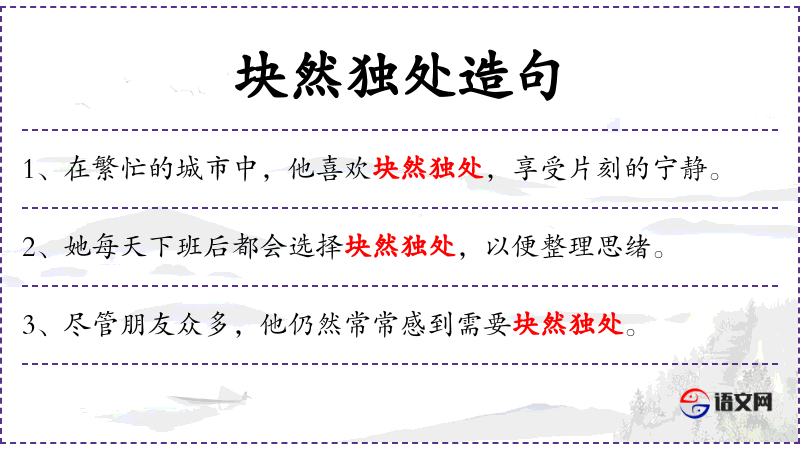 - 成语:块然独处,源自《庄子·逍遥游》,形容一个人独自一人的样子。