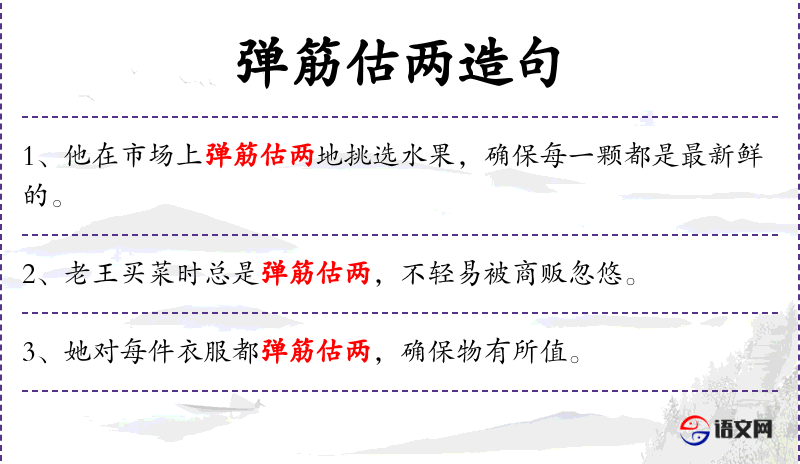 - 弹筋估两:方言,意思是仔细检查和估量物品的质量和数量。