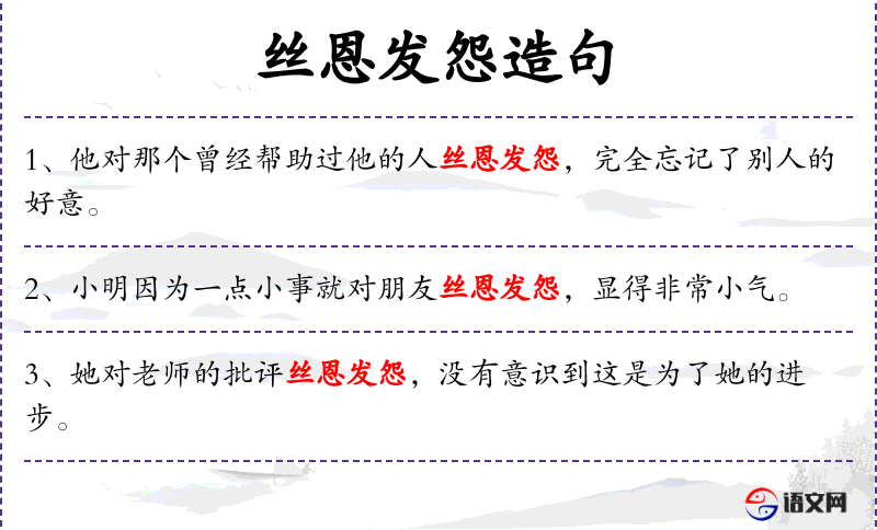 - 丝恩不怨:成语,意为虽然有恩但并不怨恨,这里可能用错了,应为“丝毫不怨”。