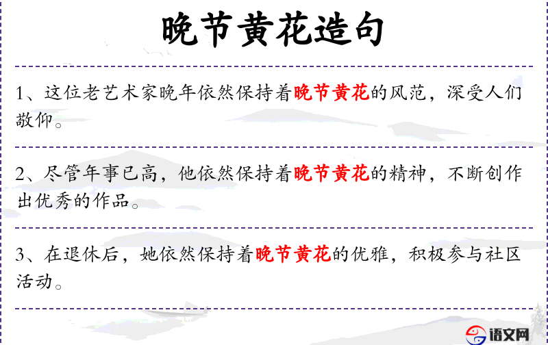 3. 【晚节黄花】 - 黄花:菊花;晚节:晚年的节操。比喻人晚节高尚。