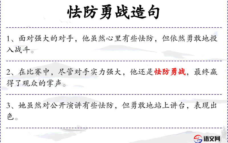- 怯防:害怕或担心,同义词有“胆怯”、“畏惧”,反义词有“勇敢”、“无畏”。