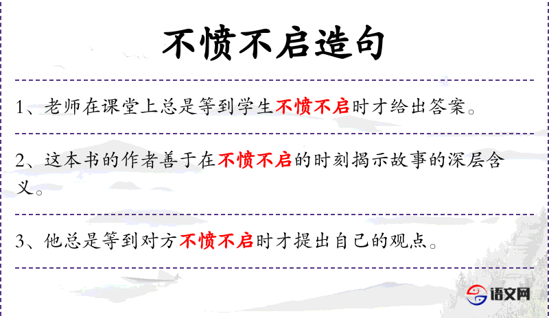 1. 【不愤不启】 - 愤:心里想弄明白而还不明白。启:启发。指不到学生们想弄明白而还没有弄明白时,不去启发他。这是孔子的教学方法。