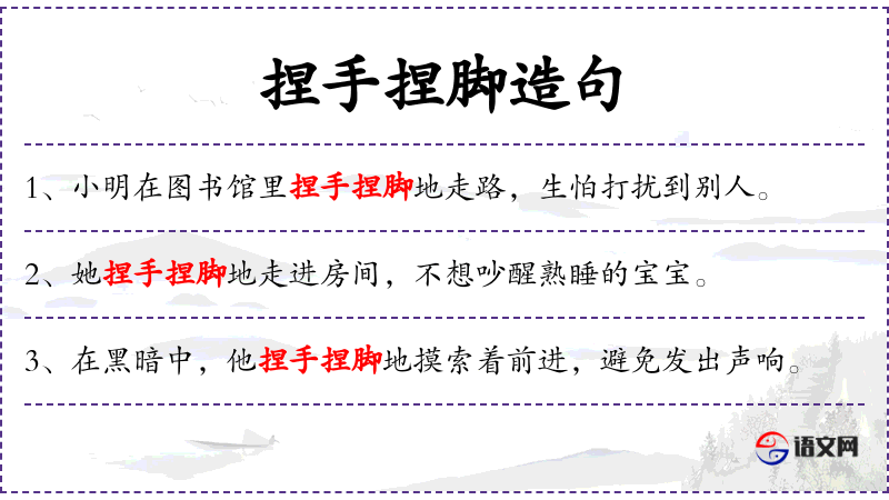 - 捏手捏脚地:形容小心翼翼、轻手轻脚的样子。