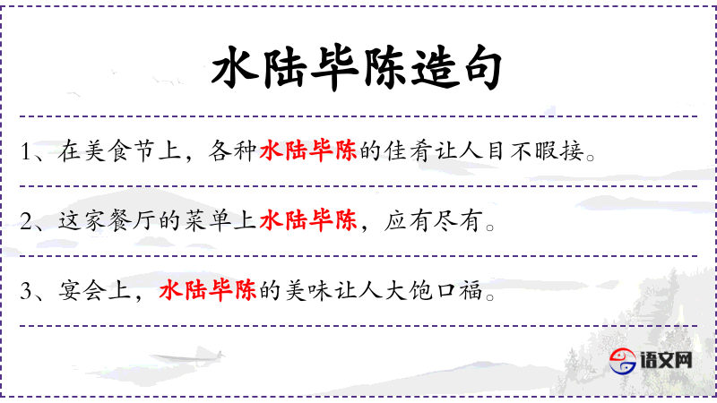 3. 【水陆毕陈】 - 水陆:指水陆所产的珍贵食物。各种山珍海味全都陈列出来。形容菜肴丰富。