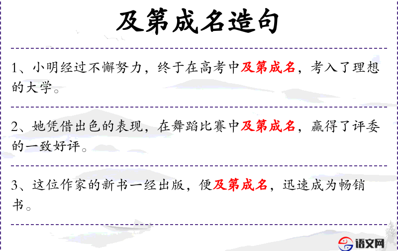 - 及第成名:指在考试或竞赛中取得优异成绩而名声大噪。