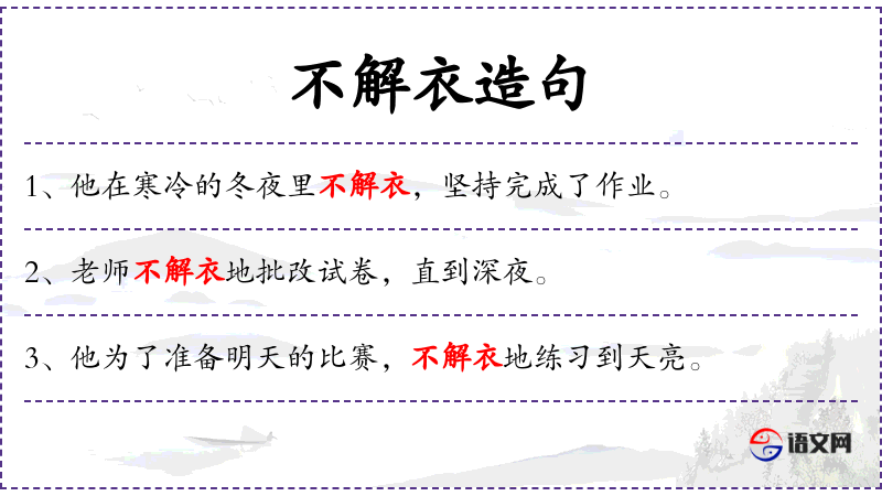 1. 【不解衣】 - 谓一上任来不及换装休息,立即投入工作。
