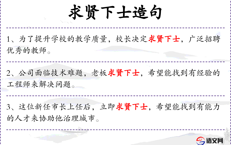 1. 【求贤下士】 访求贤士且礼遇之。