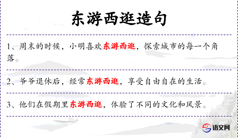 - 东游西逛:成语,形容四处游荡,没有固定目的地。