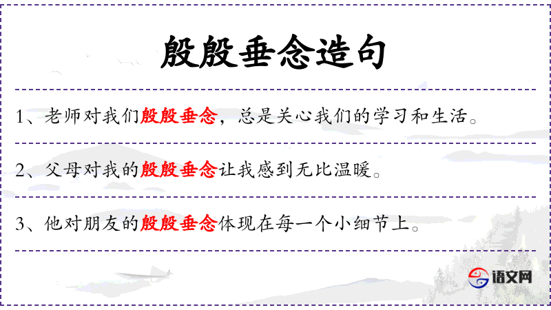 3. 【殷殷垂念】 - 殷殷:殷切,诚恳;垂念:挂念。非常殷切地挂念着。