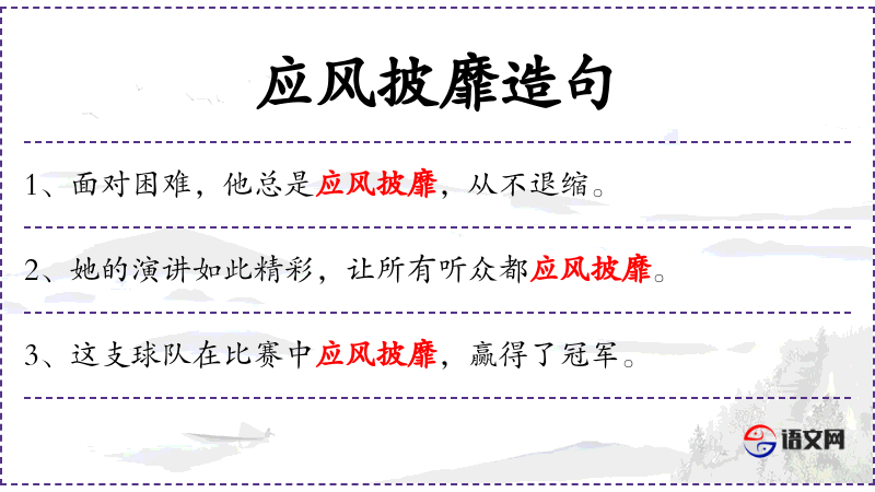 句子中的“应风披靡”是一个成语,源自古代汉语,原指草木随风倒伏,比喻事物迅速流行或广泛传播。这个成语体现了汉语中对自然现象的比喻和象征。