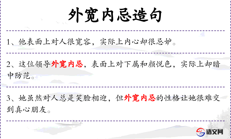 句子中的“外宽内忌”是一个典型的成语,反映了文化中对人物性格的深刻洞察。这种描述在**文化中常见,用于评价那些表面和善但内心复杂的人。
