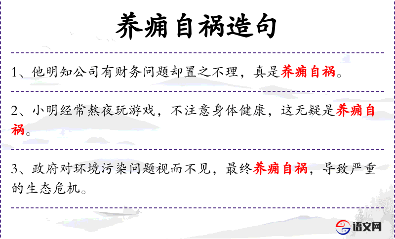 - 成语:养痈自祸,出自《左传·僖公二十三年》,比喻对问题不及时处理,最终自食其果。