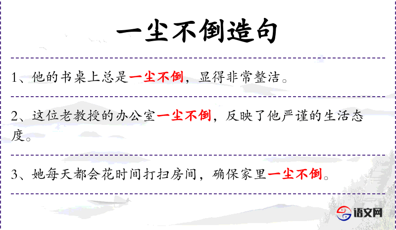 1. 【一尘不倒】 - 原指佛教徒修行时,排除物欲,保持心地洁净。现泛指丝毫不受坏习惯,坏风气的影响。也用来形容非常清洁、干净。