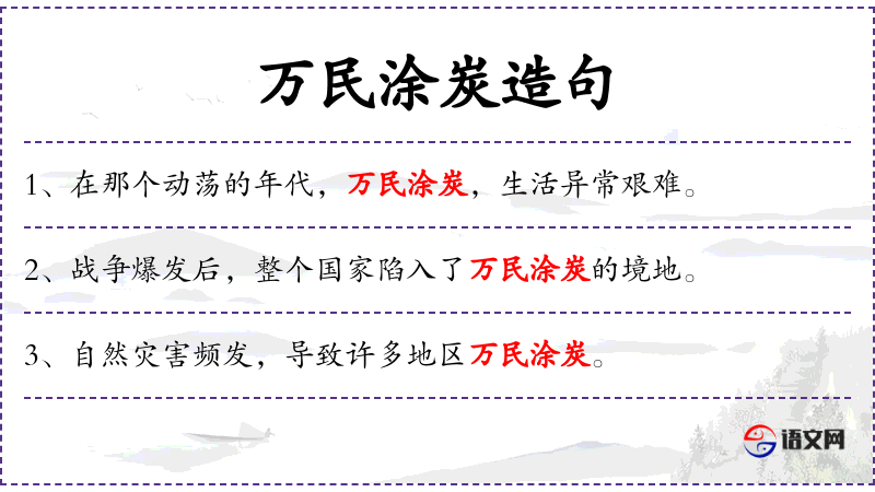 1. 【万民涂炭】 涂:泥淖;炭:炭火。万民如同陷入泥淖坠入火海一般。形容广大百姓陷入极端困苦的境地。
