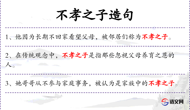 - 不孝之子:名词短语,指不孝顺父母的人。
