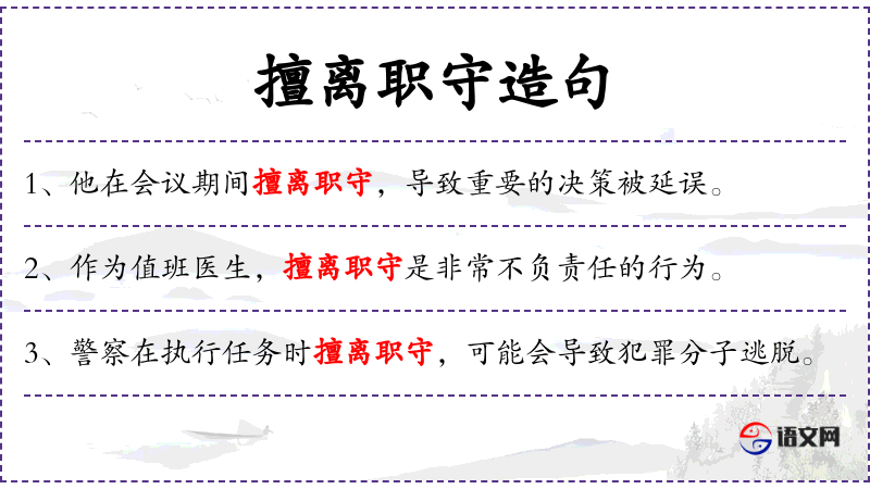 - 成语“擅离职守”源自军事用语,后泛指任何岗位上的不负责任行为。