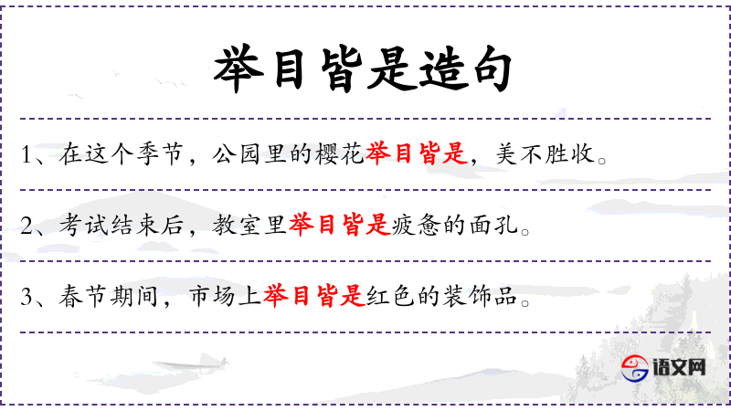 - 谓语:举目皆是
