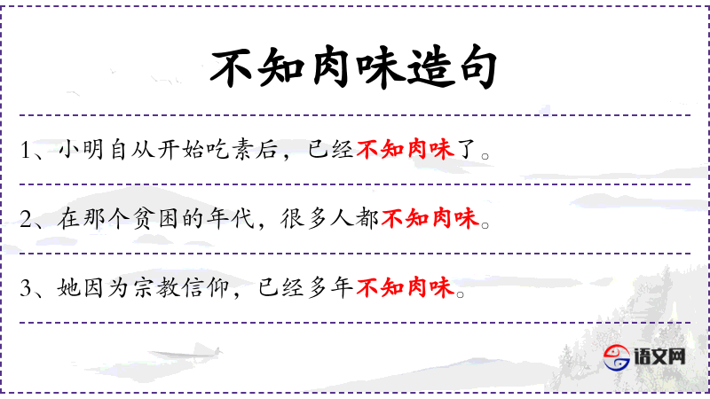 1. 【不知肉味】 原指被美妙的音乐所陶醉,因而辨不出肉味。后形容专心学习,吃东西辨不出味道。也形容生活困难,无肉可吃。