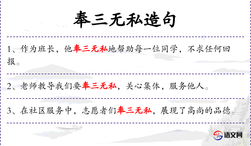 - 奉三无私:指无私地奉献,三无私可能指的是无私心、无私欲、无私利。