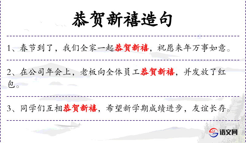 - 恭贺新禧:祝贺新年的到来,新禧是新年的意思。