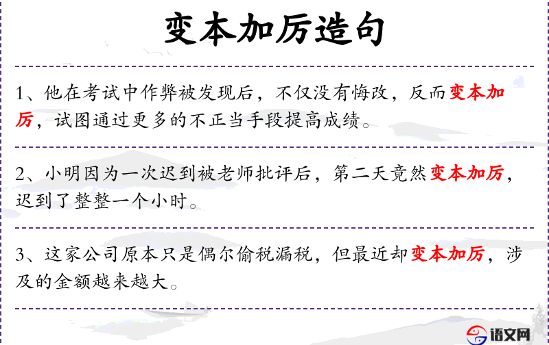 1. 【变本加厉】 厉:猛烈。指比原来更加发展。现指情况变得比本来更加严重。