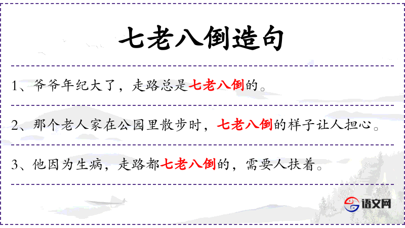 - 状语:因为中风后遗症,走路总是七老八倒的